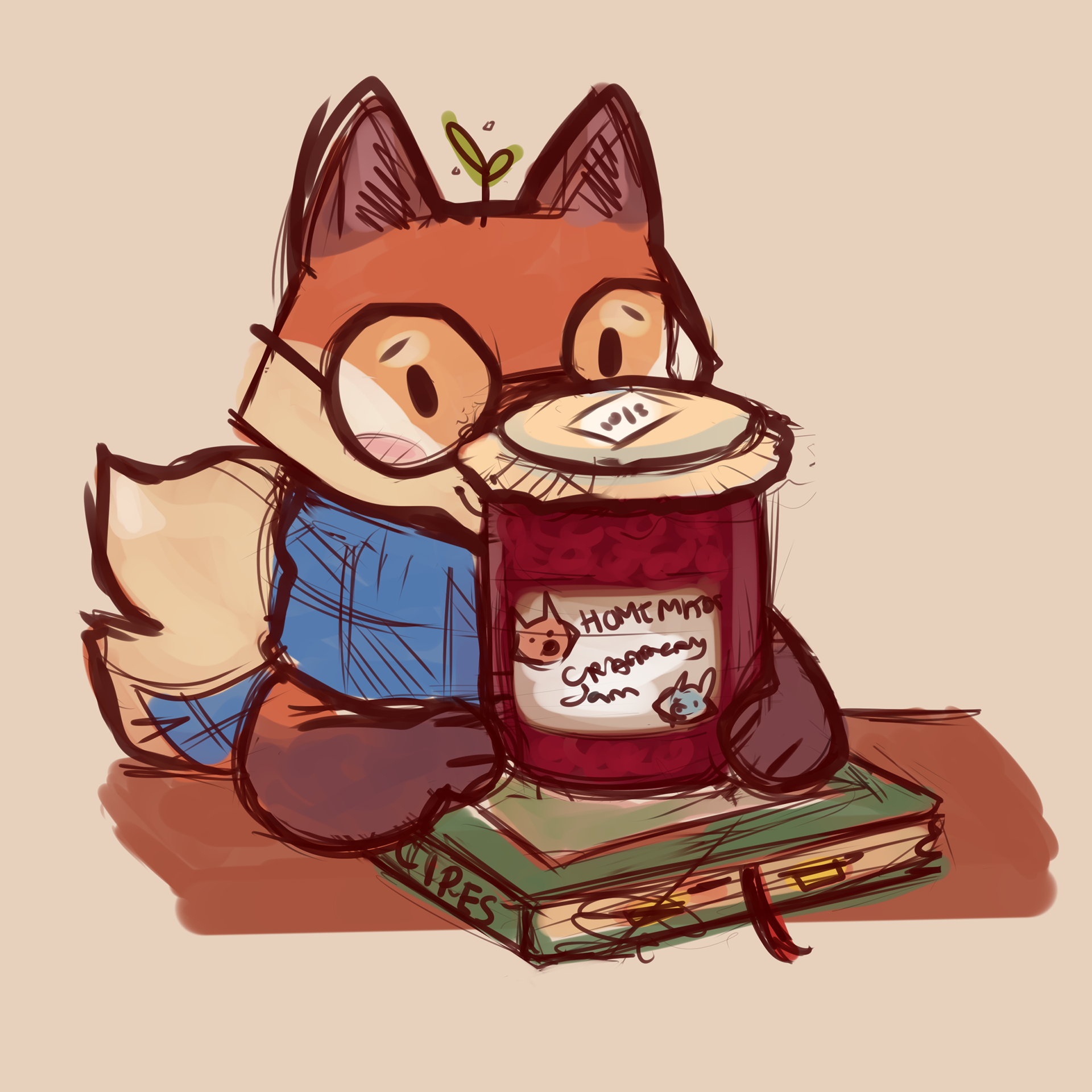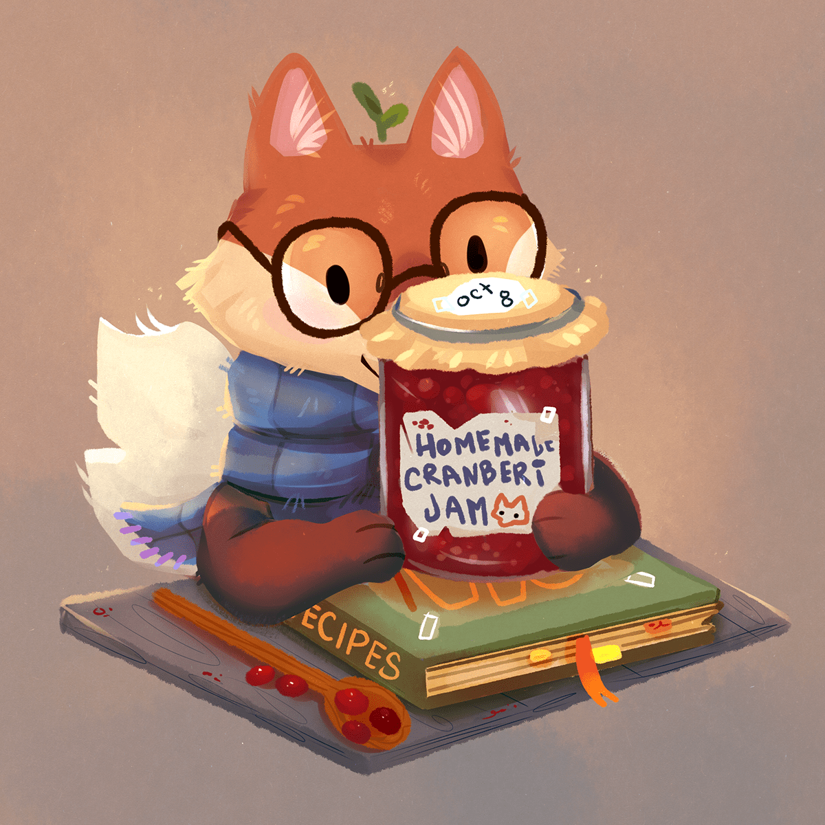 An illustration of a gentle autumn fox showing off his homemade cranberry jam.